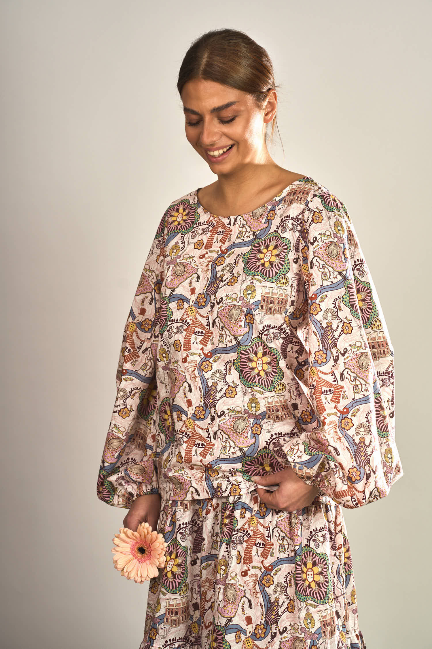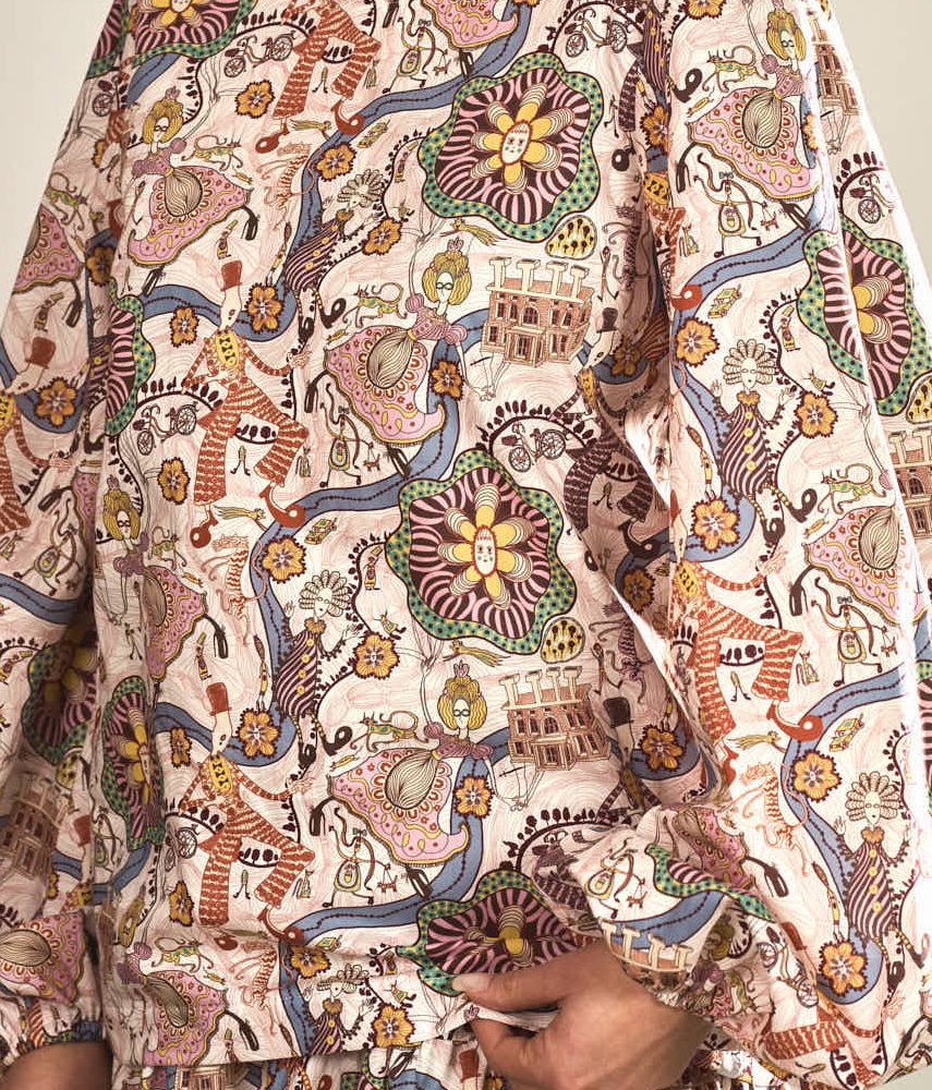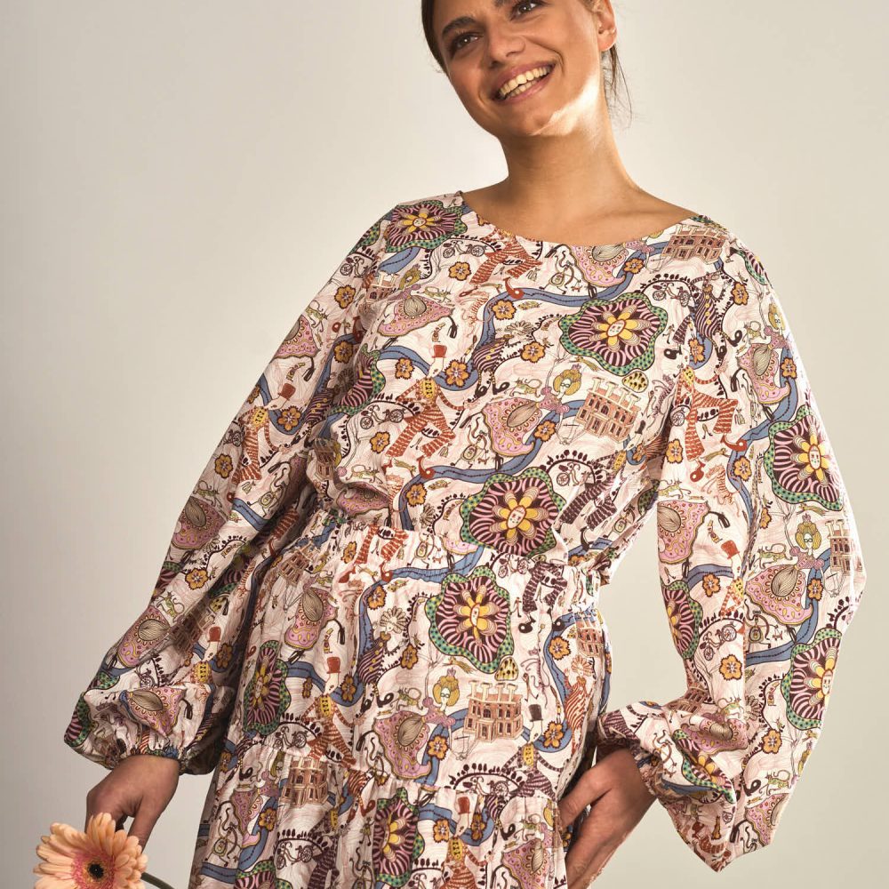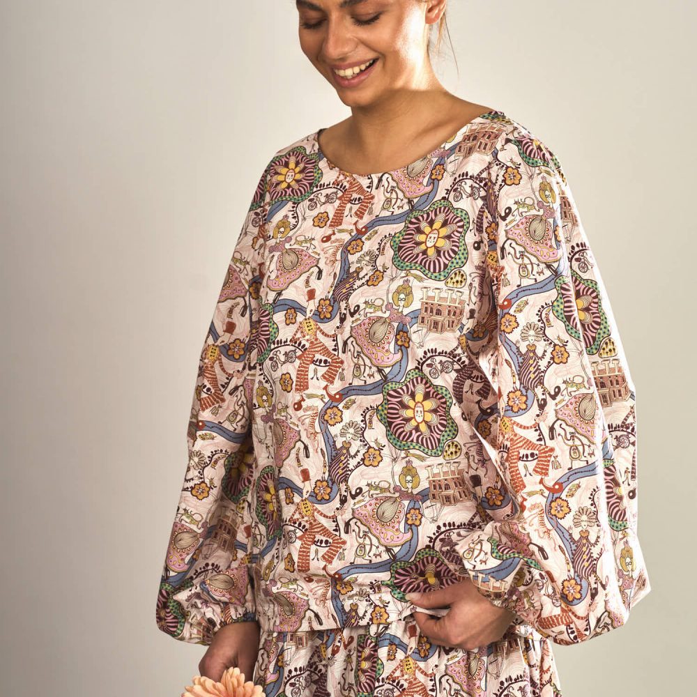 Die Brustabnäher sorgen für eine schöne Passform im Brustbereich und geben der Bluse eine feminine Form, ohne ihre lockere Leichtigkeit zu verlieren. Ein besonderes Highlight sind die weiten Ballonärmel, die dem Design eine moderne und zugleich romantische Note verleihen.