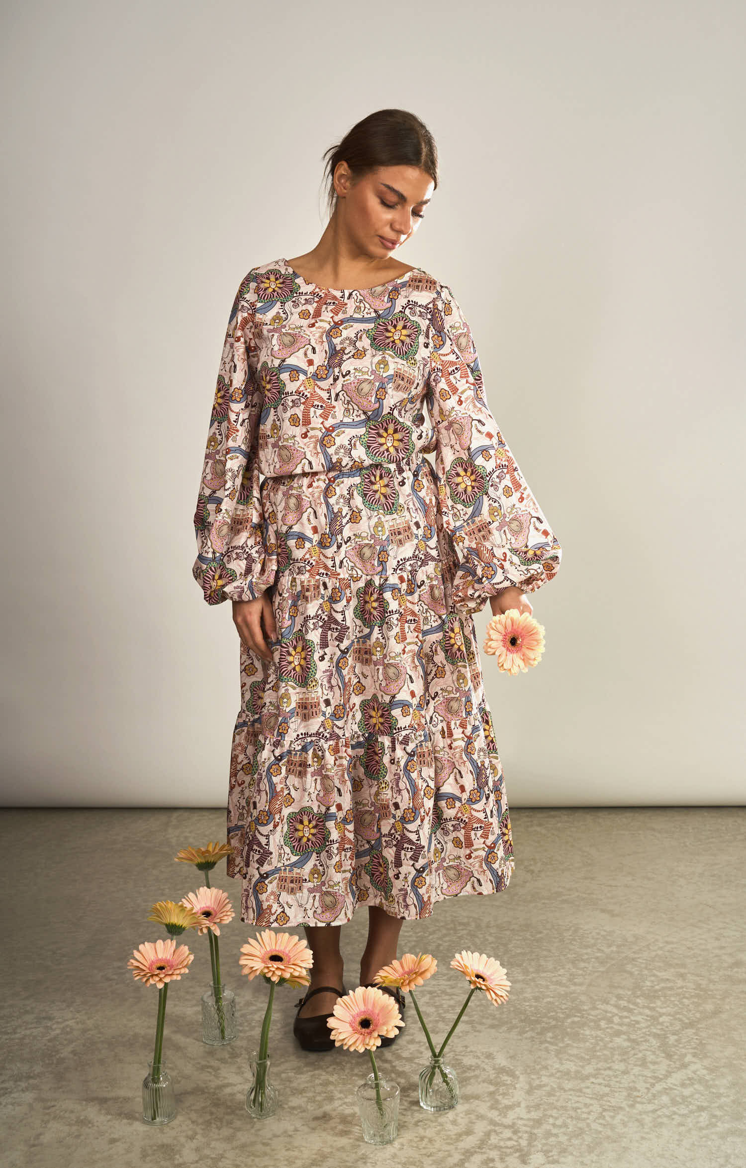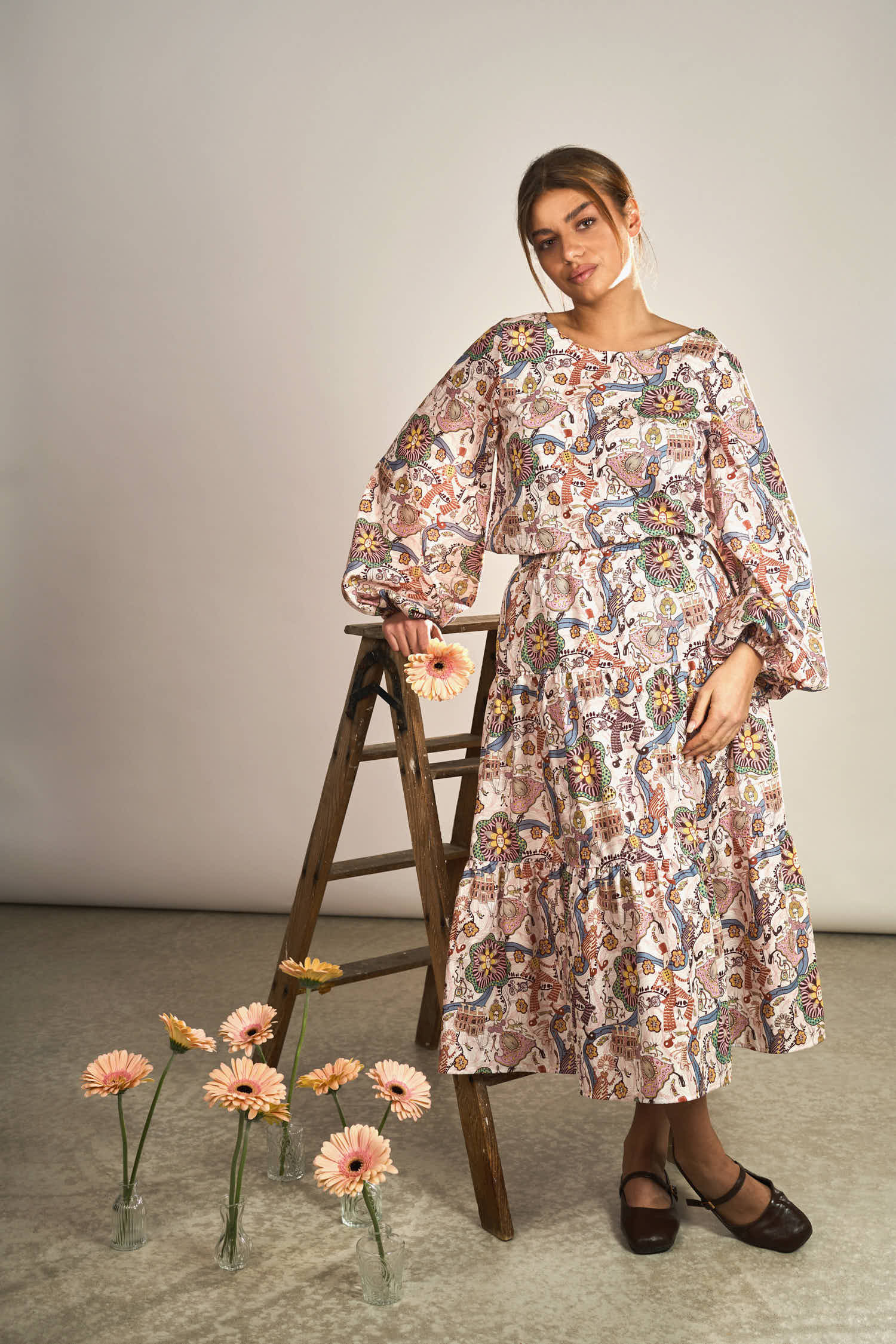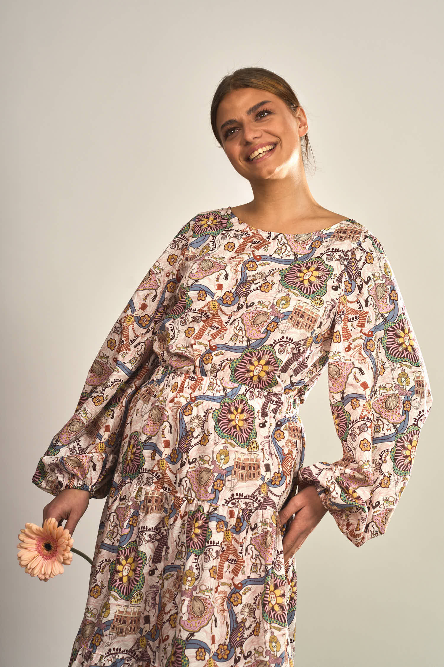 Die Brustabnäher sorgen für eine schöne Passform im Brustbereich und geben der Bluse eine feminine Form, ohne ihre lockere Leichtigkeit zu verlieren. Ein besonderes Highlight sind die weiten Ballonärmel, die dem Design eine moderne und zugleich romantische Note verleihen.